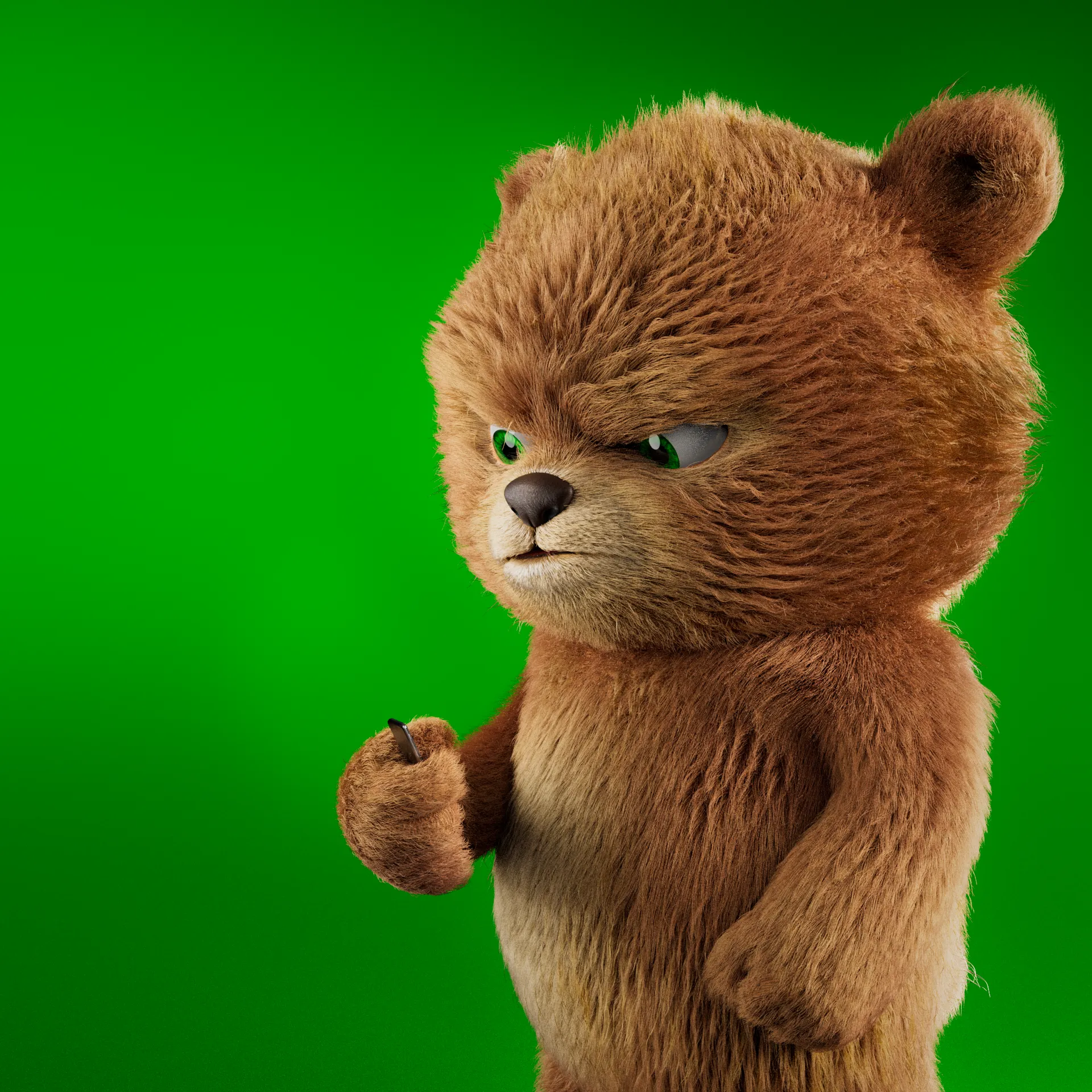 In the look development phase, Giga Bear gained his signature feel. We groomed a rich, responsive fur system, tuned his expressive eyes, and built a mouth rig for snarls, smirks, and sighs. Warm lighting and stylized shading brought out texture and attitude, making sure Giga looked great on any background.