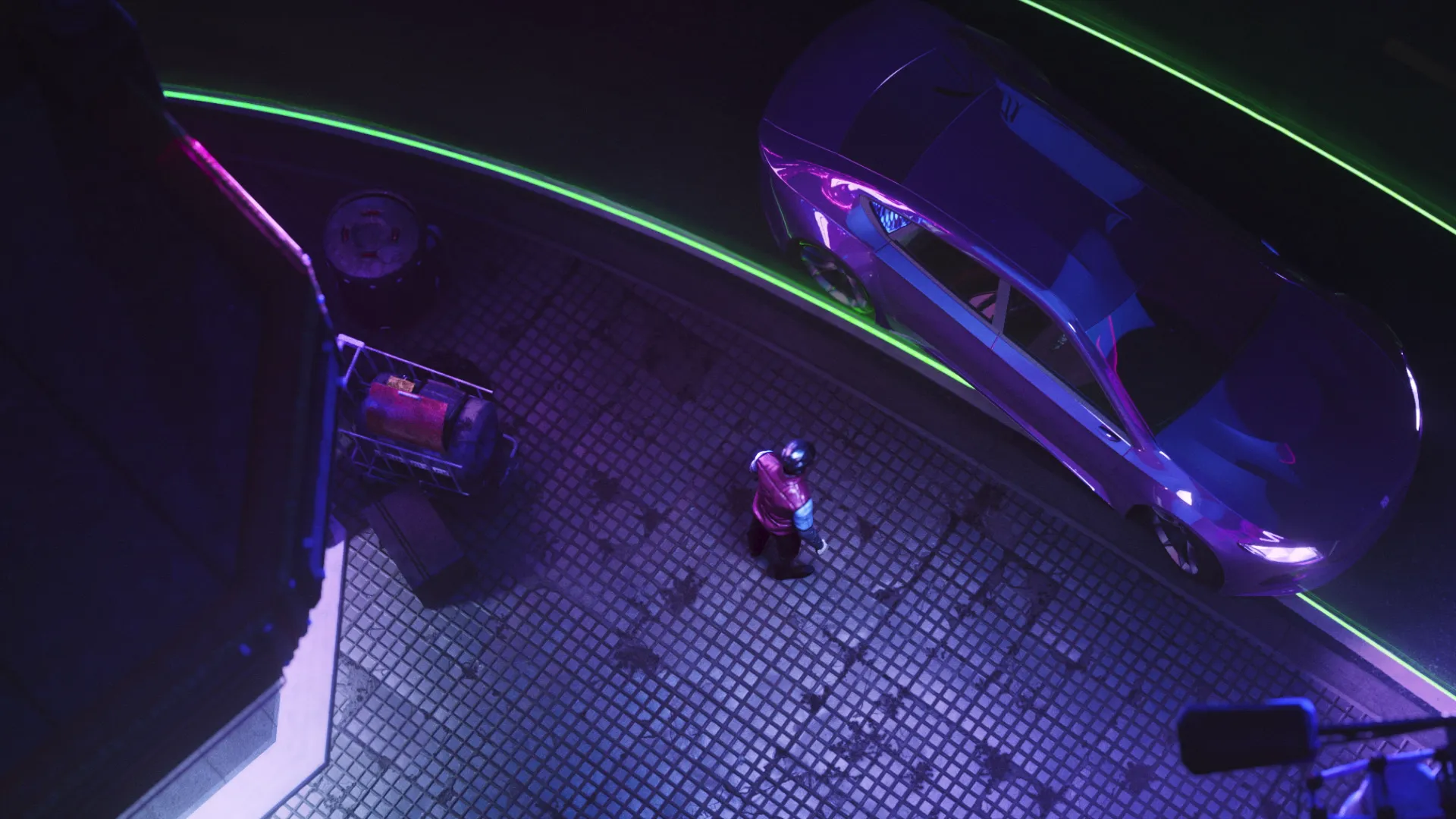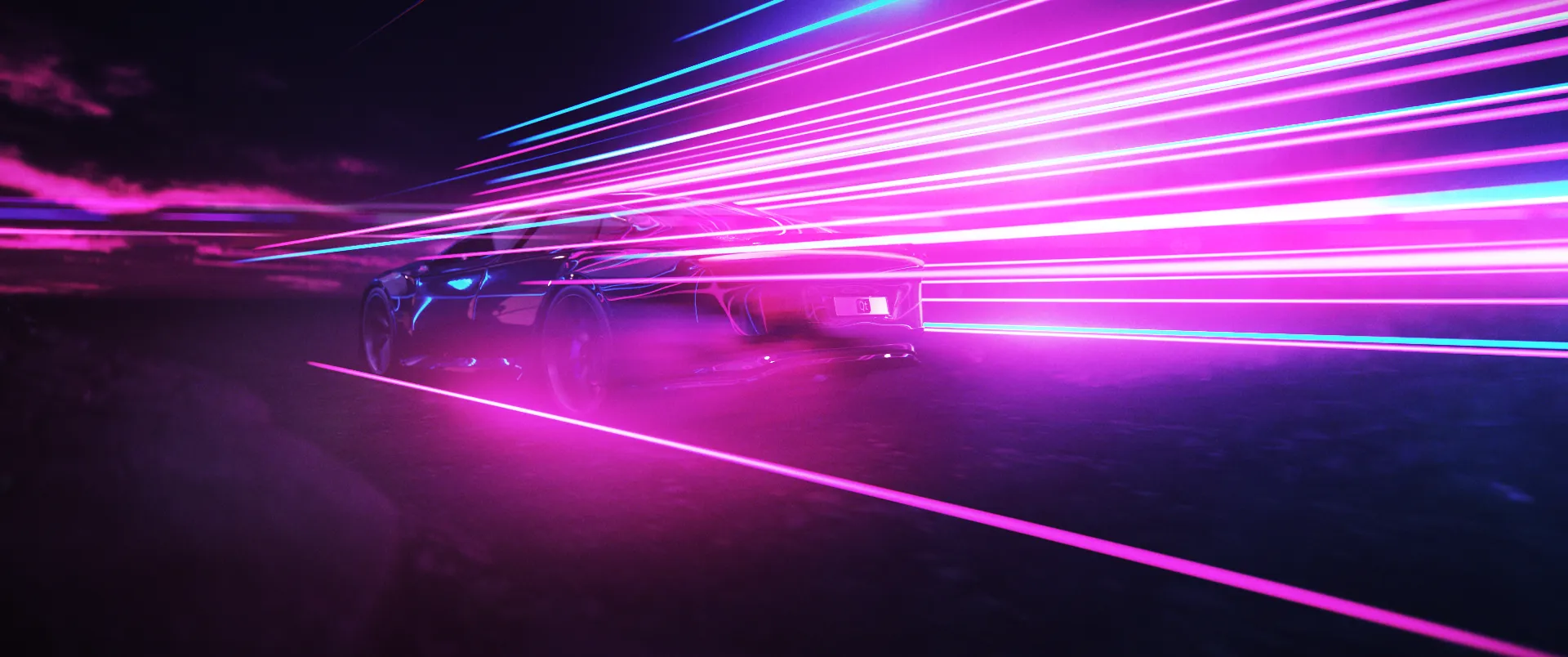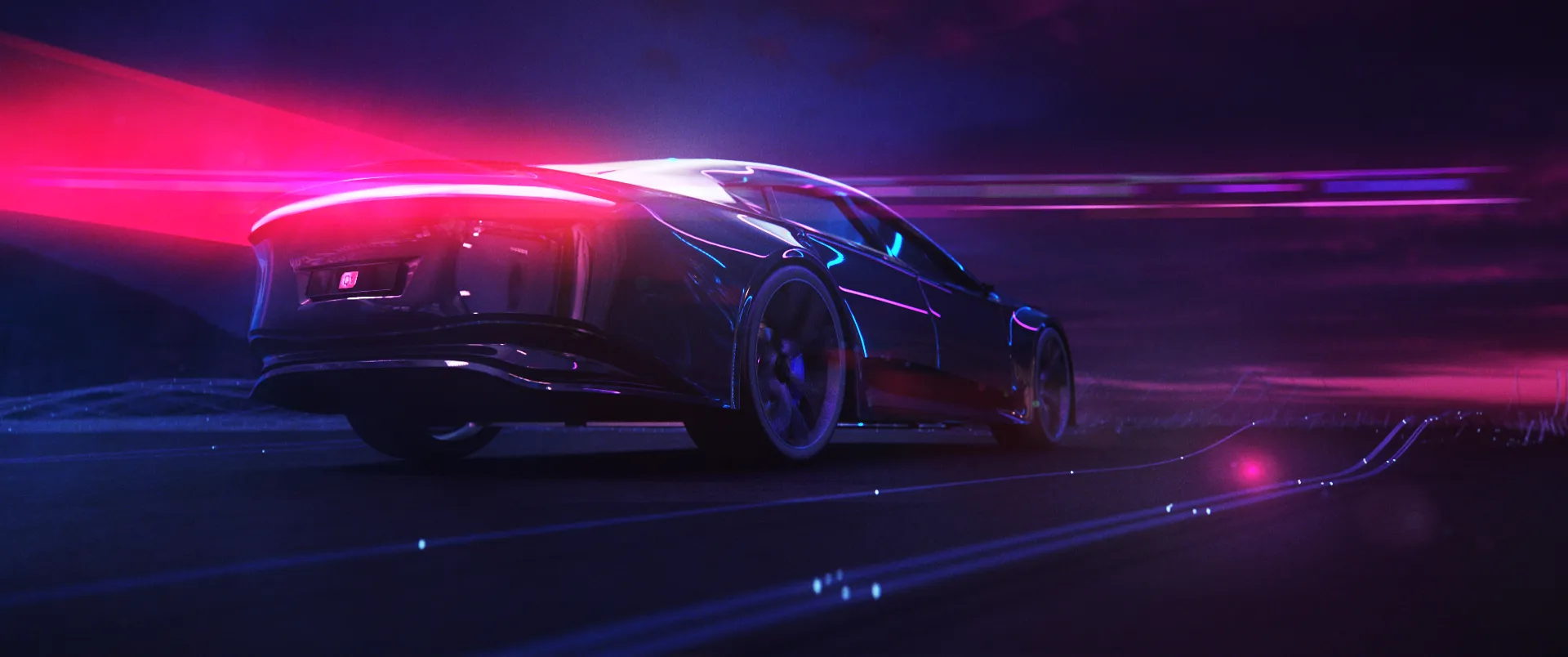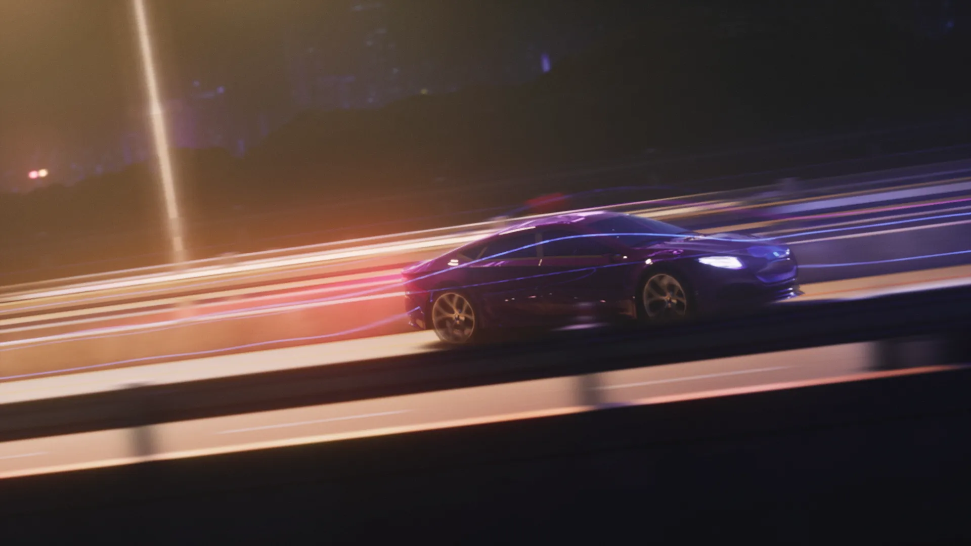 We created a very retro-futuristic, neon light and light streak filled style for the animation. It is a combination of 2030’s and 1970’s. Therefore the color palette is mainly neon purple with green and blue highlights. Also visual effects like video-like-noise and light streaks are used extensively.