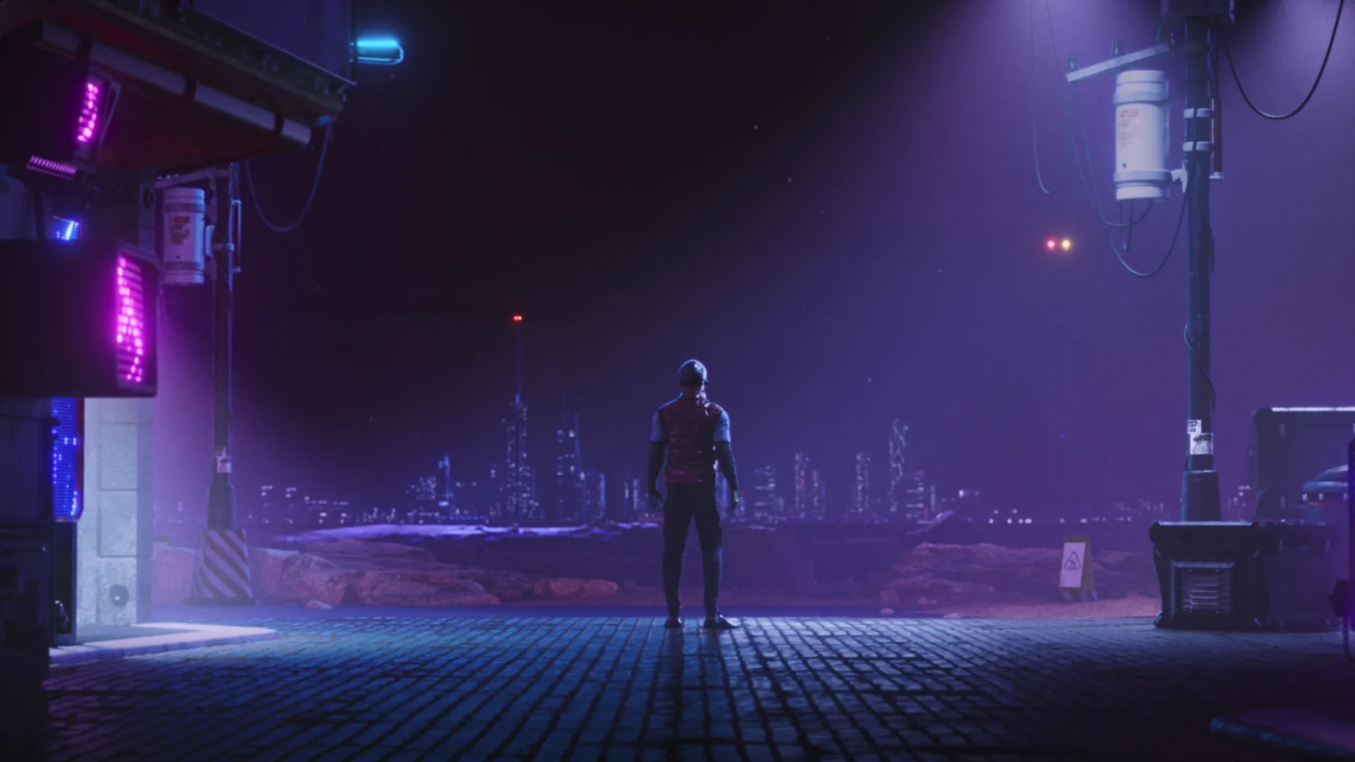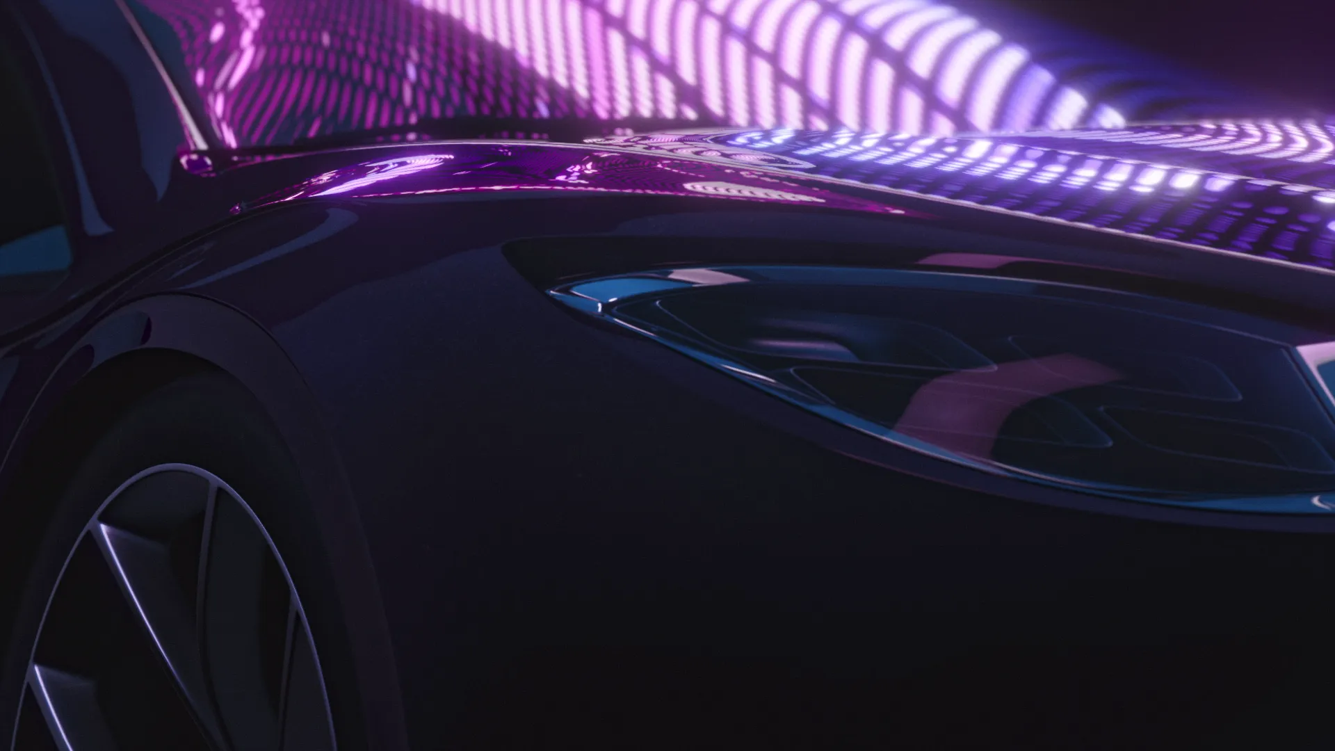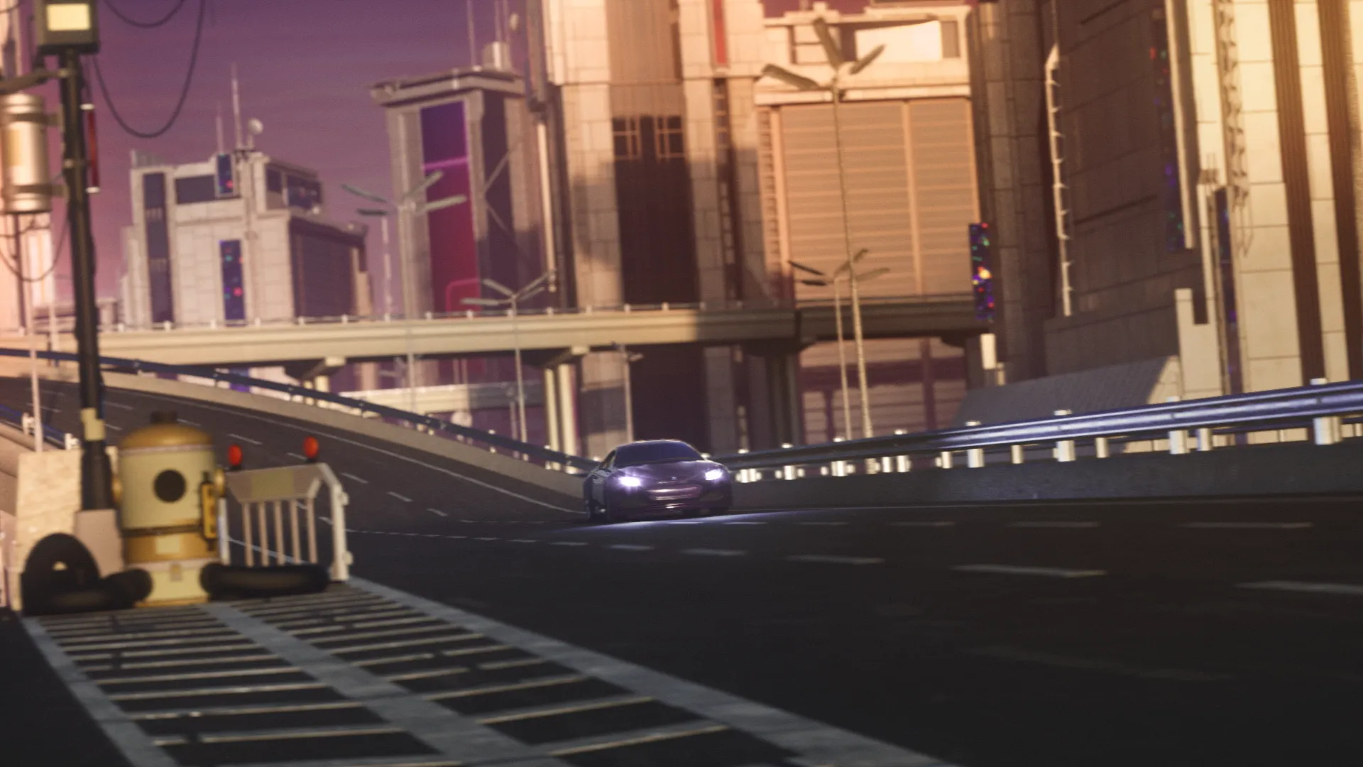 We created a very retro-futuristic, neon light and light streak filled style for the animation. It is a combination of 2030’s and 1970’s. Therefore the color palette is mainly neon purple with green and blue highlights. Also visual effects like video-like-noise and light streaks are used extensively.