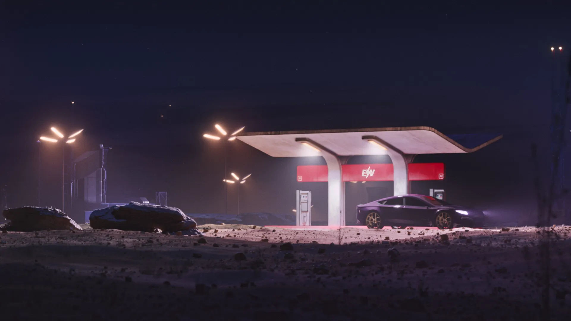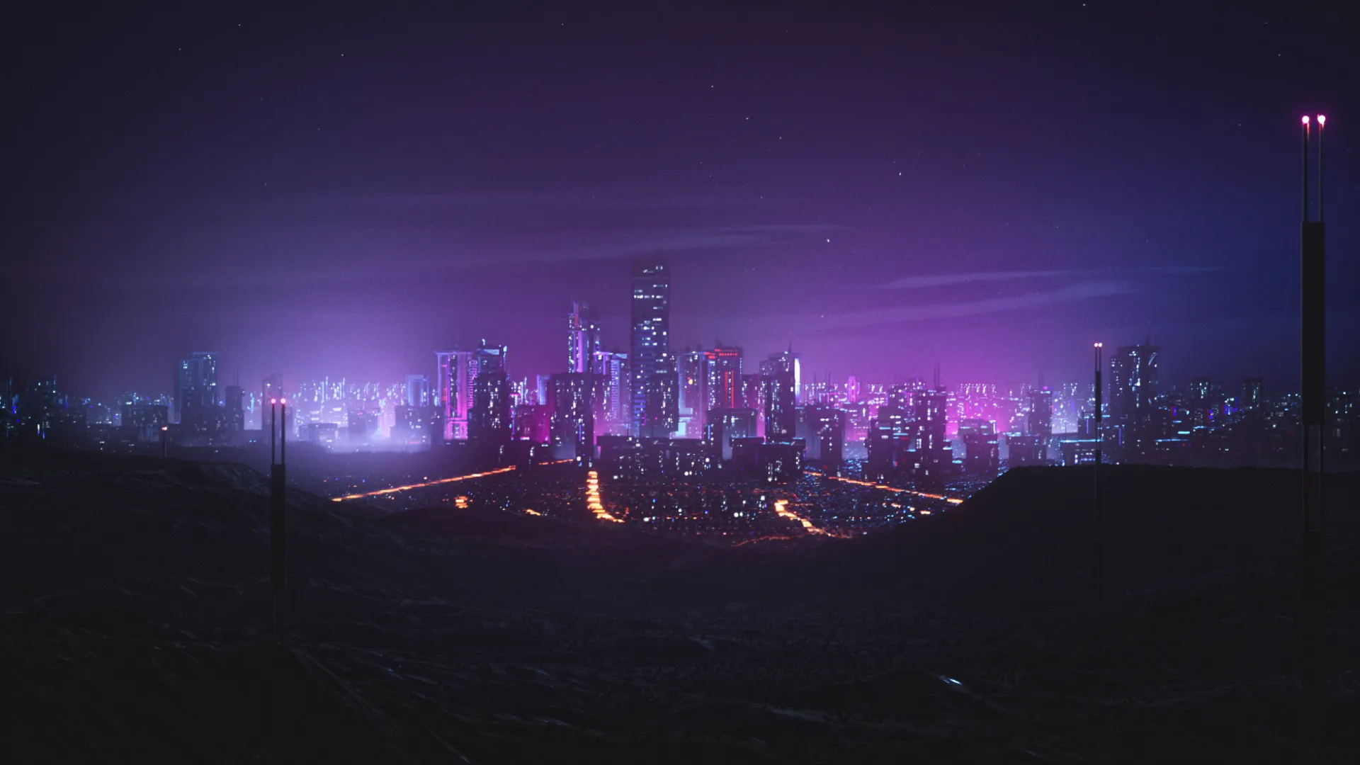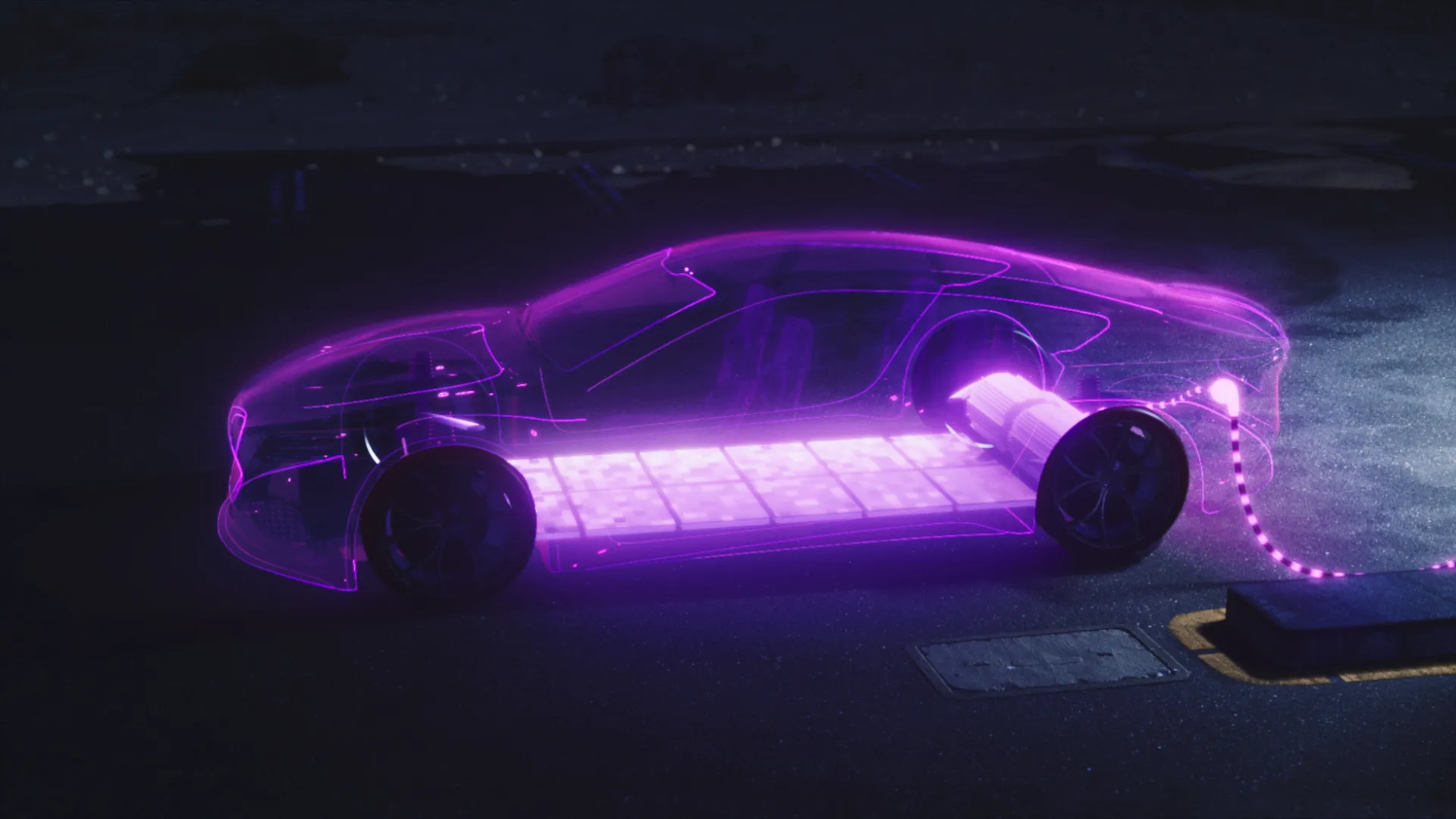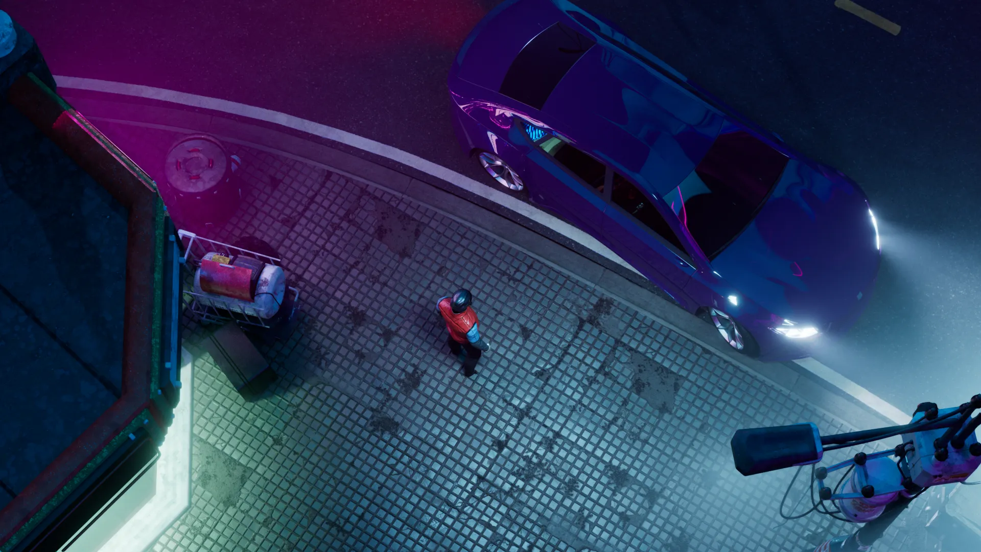 We created a very retro-futuristic, neon light and light streak filled style for the animation. It is a combination of 2030’s and 1970’s. Therefore the color palette is mainly neon purple with green and blue highlights. Also visual effects like video-like-noise and light streaks are used extensively.