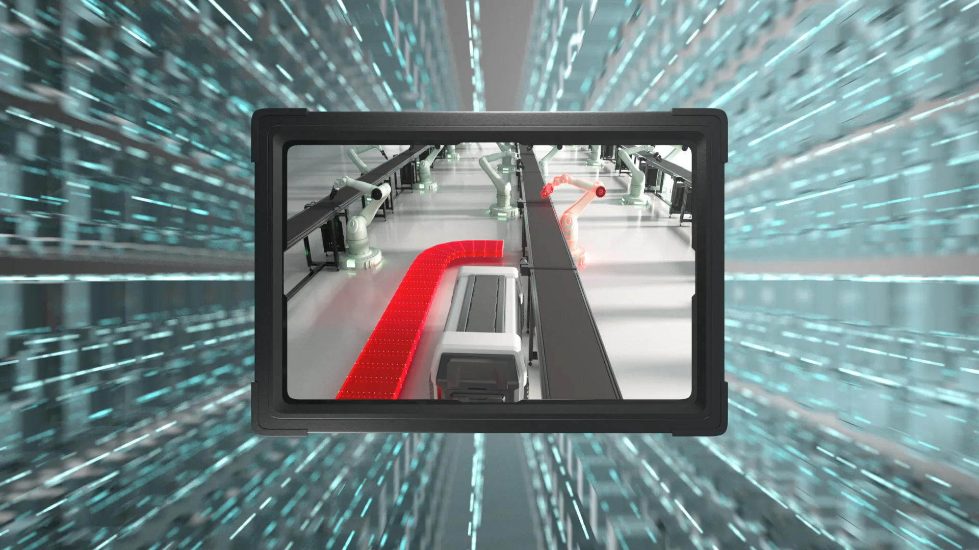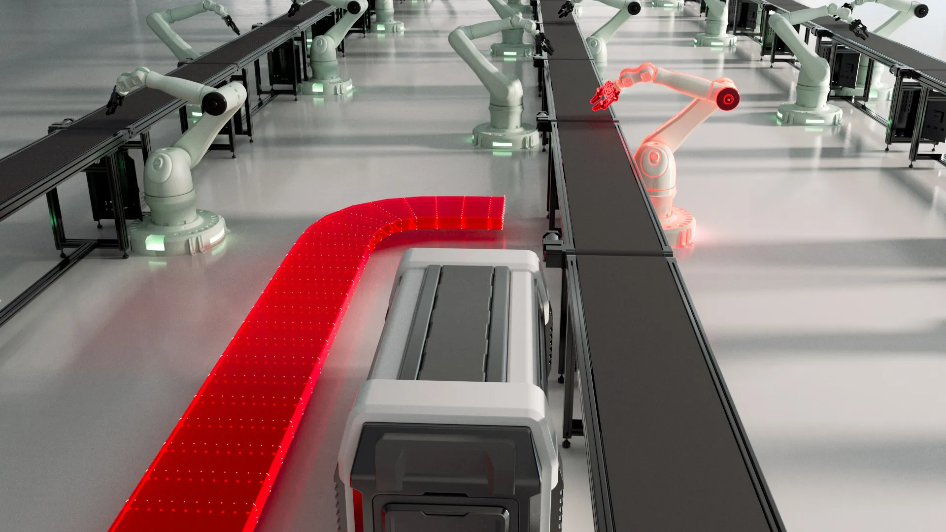 We used 3D graphics to design an imaginary automation facility that does not necessarily underline any specific industry.
